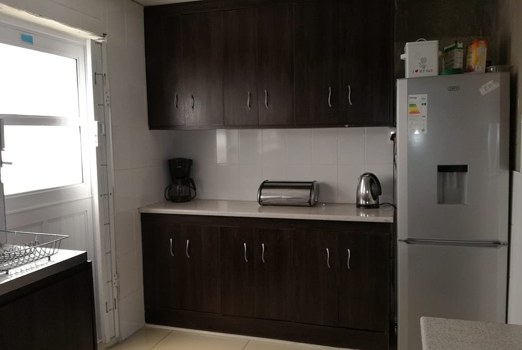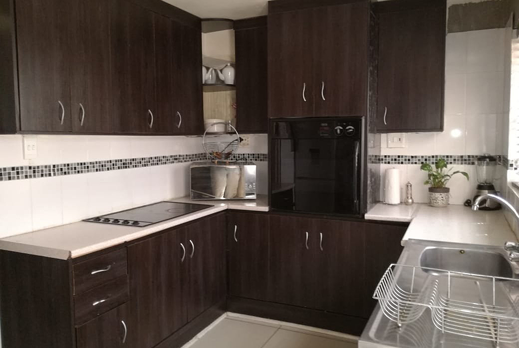 Fully fitted modern kitchen with tiled walls and floors, aluminium back door leading to a fully enclosed backyard.