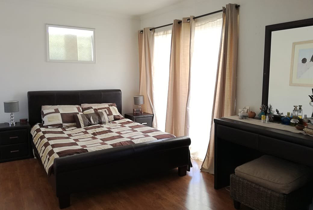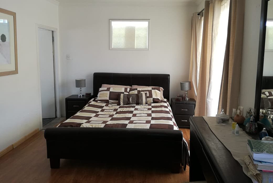 Main bedroom includes wall to wall built in cupboards, laminated flooring, fully tiled en suite and a sliding door leading to a balcony.